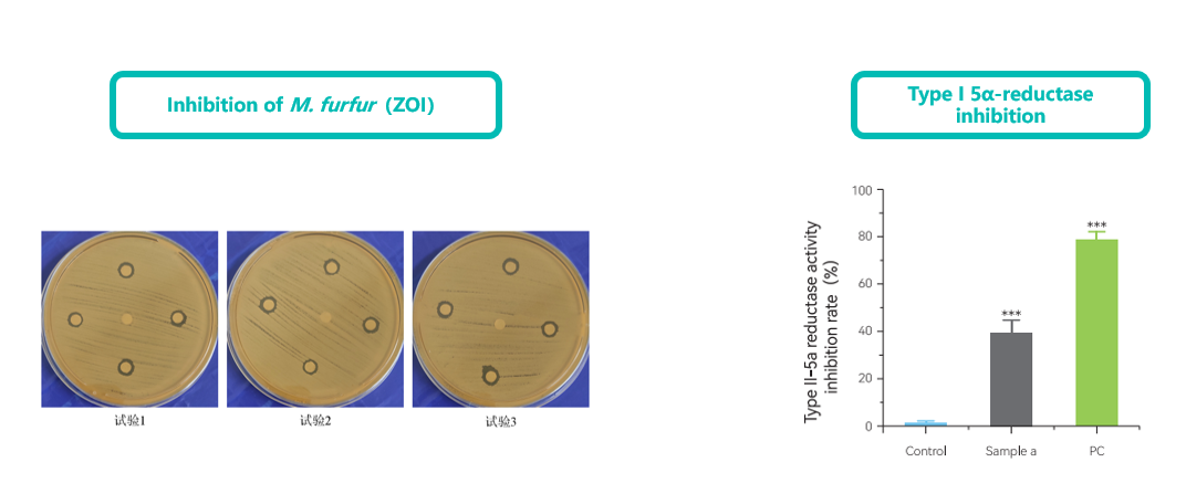 Anti-peeling/ Anti-dandruff/ Scalp care | Inhibition of Malassezia | Bacterial growth inhibition zone, MIC |